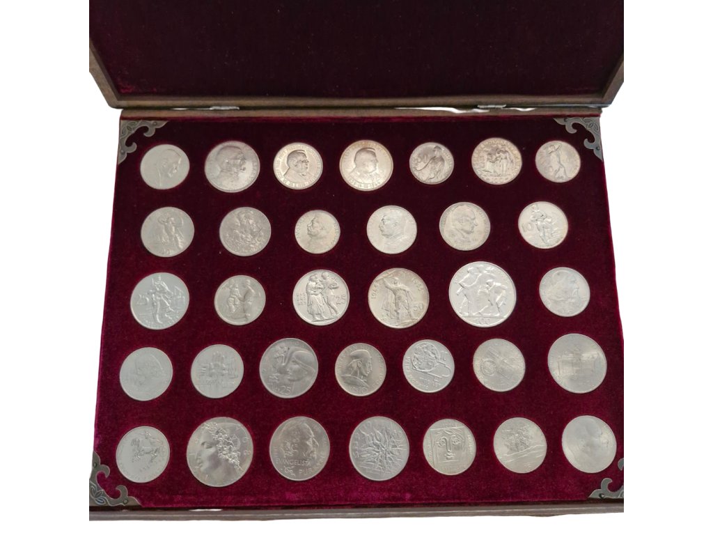 Zbierka strieborných pamätných minci od roku 1928 po 1990 v peknej drevenej kazete